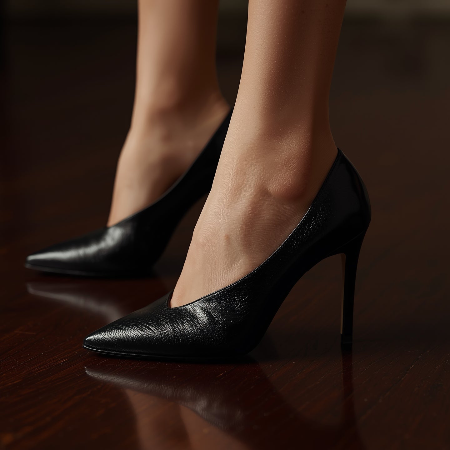 Crafted for the discerning wardrobe, the Mondivaire Noir Élan features sleek black leather heels with a precisely tailored modern silhouette. The distinctive V-cut vamp subtly elongates the leg, enhancing your posture and presence. Finished in a rich deep black, these heels are essential for confident, power dressing. Available in US sizes 6 to 11, each pair weighs 1.6 lbs, balancing style with comfortable wearability.